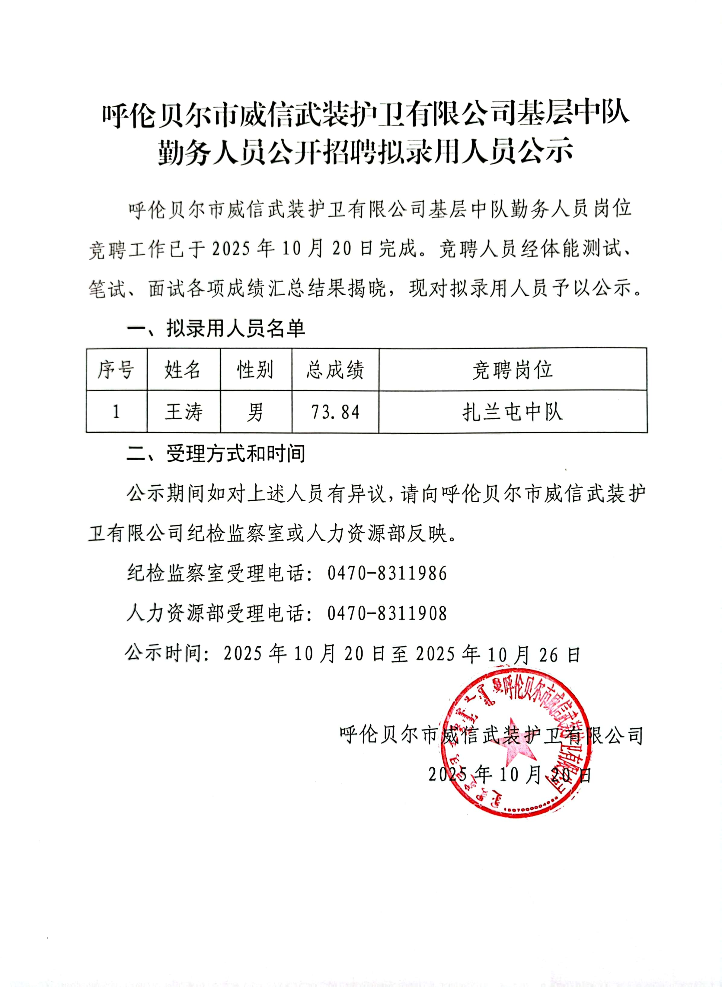 呼伦贝尔市威信武装护卫有限公司基层中队勤务人员公开招聘拟录用人员公示